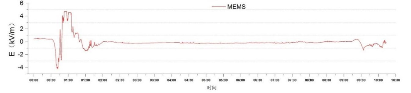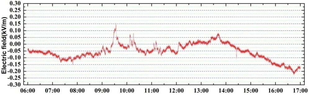 a.工作原理示意图 b.敏感芯片 图6.2 电场传感器测量原理 电场敏感单元采用非接触式测量方式进行电场测量,是由中国科学院空天信息创新研究院研制的创新产品,相较于传统的电场测量产品具有更高的可靠性和寿命,并具有探头尺寸小、空间分辨率高、功耗低、成本低、性能稳定的优点。 特点及优势: 高灵敏、低功耗的电场敏感芯片技术 传感器无电机等易磨损机械部件,功耗低、易集成 可适应各种恶劣环境 单点预警和多点组网预警 市电与太阳能双供电方式,适用于多种场合 丰富的外延设备 简单便捷的安装方式 YK-LDYJ大气电场仪使用的电场传感器主要用于监测地面大气电场,其核心探测结构电场敏感芯片,采用高可靠的气密性封装技术,提高了电场探测的准确度和长期稳定性。 ◎可适应各种恶劣环境 YK-LDYJ电场传感器无暴露可动机械部件,可用于易燃易爆场所。所采用的外壳材料在海洋和化学工业环境中具有较强的耐腐蚀能力,能适应各种恶劣的安装环境。 ◎单点预警和多点组网预警 YK-LDYJ大气电场仪的数据传输包括有线和无线两种方式,完全遵循目前最流行并且成本低廉的TCP/IP互联网协议;用户可以通过各种局域网或广域网接入服务,所以便于实现雷电单点预警或多点组网区域预警。 ◎两种供电方式(太阳能、市电),适用于多种场合 YK-LDYJ大气电场仪可采用太阳能和市电两种供电方式,整体工作功耗不超过2W,在不方便接入市电且无防爆要求的应用场合可采用太阳能供电方式。 ◎丰富的外延设备 由于YK-LDYJ大气电场仪完全使用标准化的工业接口,因此可以与许多其它厂商的外延设备(报警、通讯、断路器等)对接,从而满足特殊环境的要求。 ◎简单便捷的安装方式 YK-LDYJ大气电场仪分为四个部分(传感器、控制器、供电单元、客户端软件),安装非常方便。 电场传感器在不同天气下的数据曲线如图6.3所示,雷电产生的条件是雷雨云有电荷积累。雷雨云的靠近与雷电的发生引起地面的静电场发生了剧烈变化。以在平地距地面约1.5m处设立的检测点为例,在通常的标准情况下(平地、平原、没有尖端放电),在一个无云天气检测到的平均场强约为150V/m左右,而当场强检测值达到2kV/m以上时,通常意味着该地点上方雷云已经产生;如果场强持续增大至4kV/m,发生雷闪现象的可能性就将超过90%;雷闪发生时,场强会增大至6kV/m以上。一般情况下,独立雷云(对流雷云)或雷云群的产生需要至少约20分钟。当地面场强达到2kV/m 以上时,说明该地点雷雨云正在逐渐形成或正在靠近。 电场传感器主要用于侦测近地面电场变化情况,能够通过对电场强度、极性变化的探测和分析,实时地监测本地雷云变化,并对可能造成雷击危险的大气电场变化加以识别和预警。 图6.3(a)是在晴天下所测得的数据曲线,整体电场平稳波动不大;6.3(b)、(c)为在雷电天气下所测得的数据曲线,在雷电积聚过程中电场值逐渐升高,在发生雷电放电时电场值剧烈波动。