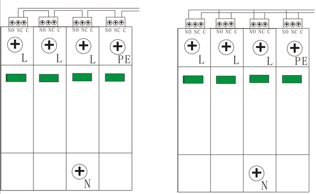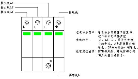 ※ 安装要求: 1、 安装人员需持有国家认可的电工牌照,严格按照电工要求操作。 2、 电涌保护器的正常工作条件必须满足,电网电压不得超出电涌保护器的最大持续运行电压,电涌保护器的工作环境必须符合产品性能参数的要求。 3、 电涌保护器电源连接线选用黄、绿、红、蓝多股铜芯线,接地连接线选用黄绿双色多股铜芯线。 4、 电涌保护器各连接线线径应符合标准要求,相线不应小于10mm2,地线不应小于25mm2。(参照标准GB 50343-2012 表6.5.1要求) 5、 电涌保护器各连接线长度不宜超过0.5米,敷设应短而直,不能折弯或盘绕。 6、 电涌保护器前端建议串接保护装置,参见产品性能参数表。 7、 电涌保护器应安装在靠近配电处,对地接线法应安装在主线路过流保护装置的符合侧,3+NPE零地保护接线法应安装在主线路过流保护装置的前侧或负荷侧。 8、 限压型电涌保护器在与前级开关型电涌保护器配合使用时,安装距离应大于10米(推荐距离≥15米),与前、后级限压型电涌保护器配合使用时,安装距离应大于5米(参照标准GB 50343-2012 第5.4要求) 9、 安装电涌保护器的配电柜、配电箱在作绝耐压测试前必须将电涌保护器前串接的保护装置置于“OFF”状态。 10、 接地要求参照国标GB 50343-2012第5.2.5要求。 11、 使用6*100mm十字或者一字螺丝刀进行安装。 ※安装步骤: 1、取下电涌保护器上下端口螺丝盖片,将设备固定到35mm安装导轨或固定到配电箱内部。 2、先将接地连接线接入电涌保护器标有PE的接线端口,锁紧螺丝;再将电涌保护器电源连接线通过串接的保护装置后,接入电涌保护器标有L、N的接线端口,锁紧螺丝丝。建议螺丝扭力为390N-490N。 3、停电,将各连接线另一端连接到电源配电箱内对应的L、N和PE端子上。 4、盖上电涌保护器上下端口螺丝盖片,通电。 ※安装检查: 1、对照安装步骤和安装示意图,检查安装是否正确。 2、通电检查负载应正常工作,否则检查电涌保护器到配电的连接线,并检查确保电涌保护器前置保护装置置于导通状态。 3、模块窗口检查(指示颜色为绿色时表示模块工作正常;为红色时表示模块防雷功能失效,应立即更换可更换模块),遥信报警检查(如果已介入遥信报警功能)。 三、安装示意图